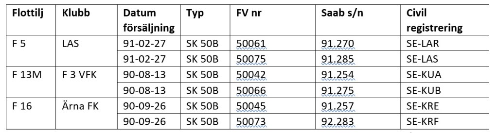 Efter FMV hemställan 1989-12-29 till Regeringen medgavs FMV i regeringsbeslut 1990-05-23 att försälja sex stycken SK 50B till de tre klubbarna, se tabell 1.