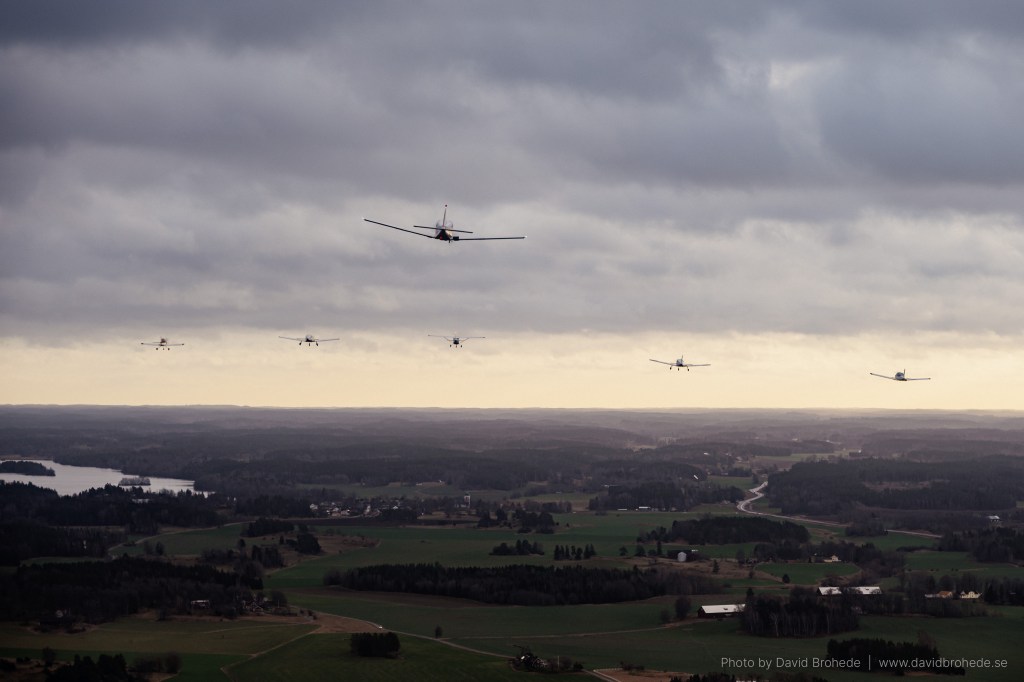 Vi lyckades i år få ihop sju flygplan och piloter med blandad tillhörighet. Linköpings Flygklubb, Malmens Veteranflygklubb samt ett antal privat ägda maskiner. Längst fram SE-FML, en Cessna FR172F ”Reims Rocket”. På vänster sida SE-LRL, en Piper PA-28 Archer III och SE-XTT, en Vans RV-8. På höger sida SE-KIT, En Piper PA-28 Archer II och SE-MAT en Piper PA-28R-200 Arrow II. Längst bak SE-ENGM, en Piper PA-28R-201T Turbo Arrow III och SE-MEK, en Scottisch Aviation Bulldog (SK 61) som även agerade som fotoflygplan och därför inbland flög lite bredvid och ovanför Julgranen.
