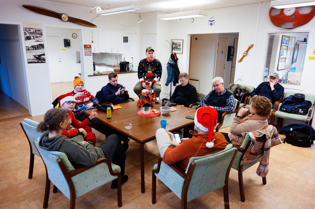Efter flygningen när alla flygmaskiner var kontrollerade och indragna i hangarfacken så samlades vi för en debriefing och en kopp kaffe. Det var en väl genomförd flygning där piloterna trots vädret lyckats hålla en snygg formation. Men vi hinner tyvärr inte träna så mycket formationsflygning som skulle önskas för att kunna hålla en tätare formation, så nyårslöftet blir nog att 2026 flyga lite mer och framför allt flyga lite mer formationsflygning!